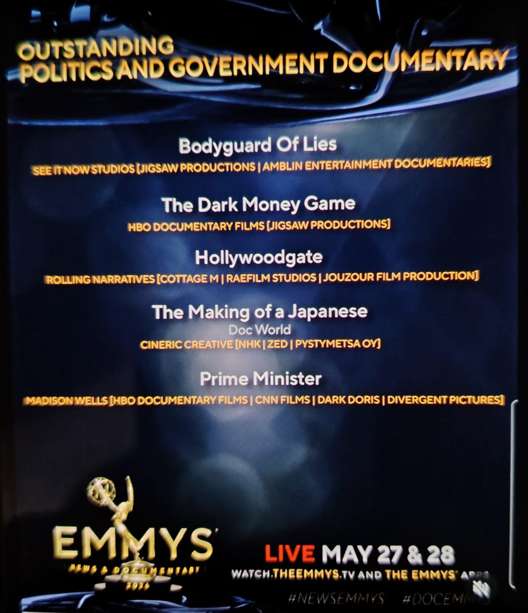 News & DOC kategorian EMMY palkinnot jaetaan New Yorkissa 27.-28.toukokuuta 2026.